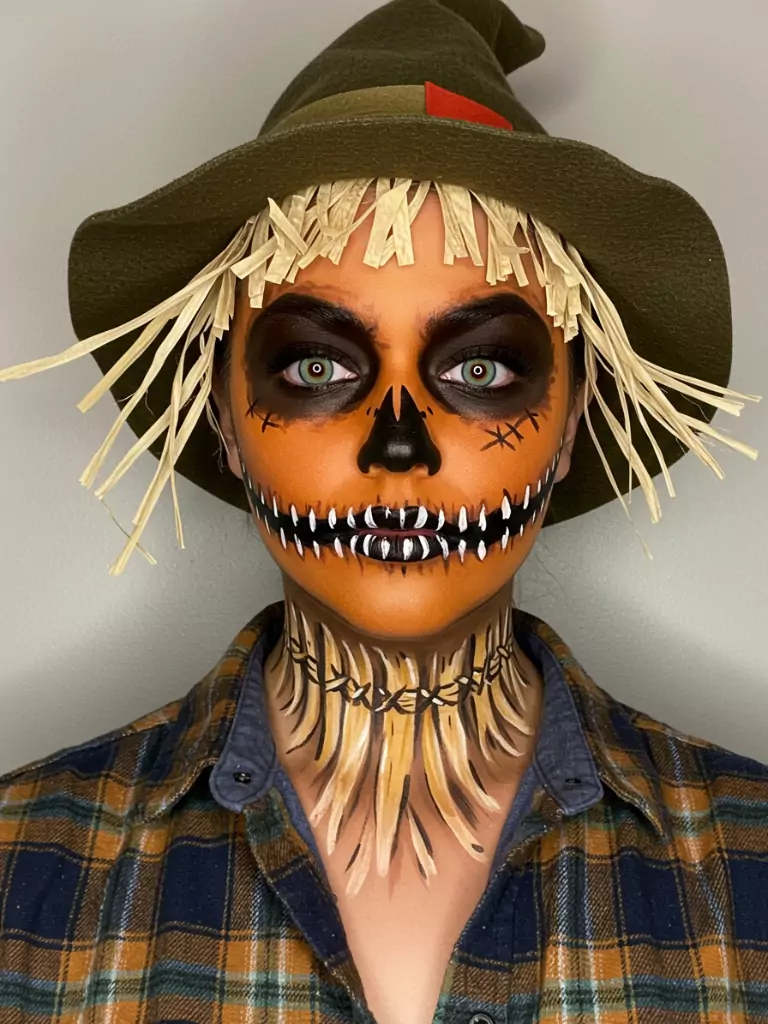 Draw a stitched smile extending past your lips. You can add straw-like strokes along your jawline for effect. With a flannel shirt and hat, you’ll pull off a rustic yet haunting Halloween look.