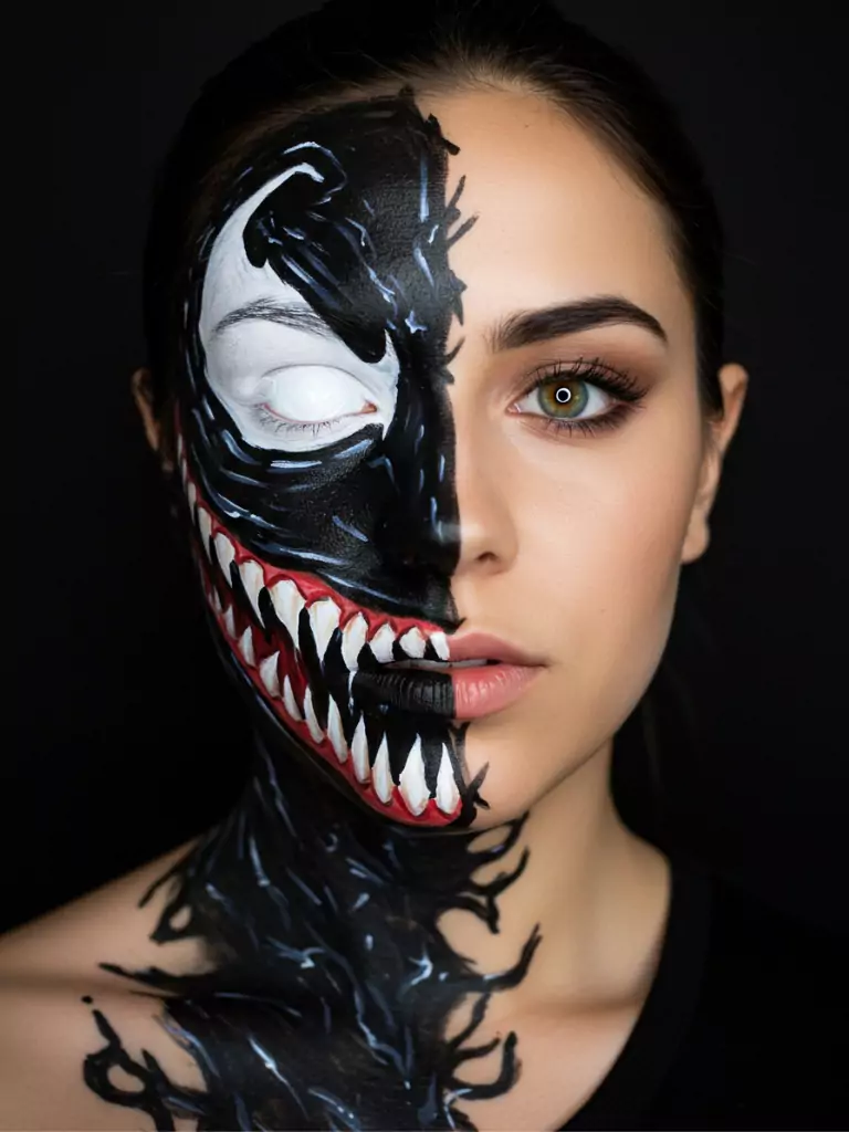 Channel your inner antihero with a Venom-inspired face paint. Start by covering half your face in black with sharp white teeth stretching across your mouth and cheek.
