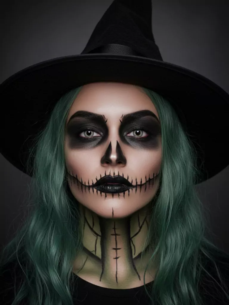 Use eyeliner to create sharp, exaggerated brows and paint your lips a deep purple or black. To make it creepier, add black lines around your mouth or dark veins on your cheeks. Pair it with a pointy hat and you’re good to go.