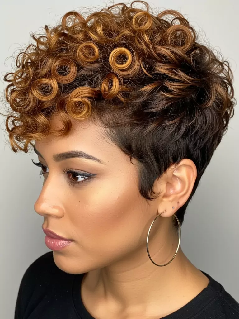 If you love a pixie cut but want to take it further, highlights are the answer. Adding streaks of caramel, gold, or auburn brightens up your natural coils and gives them dimension.
