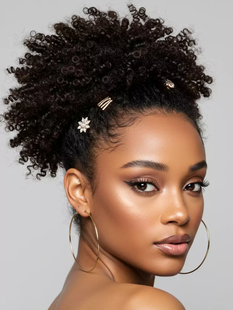 Accessories can instantly upgrade a simple puff into a statement look. Gather your curls into a puff and add cuffs, barrettes, or decorative pins.