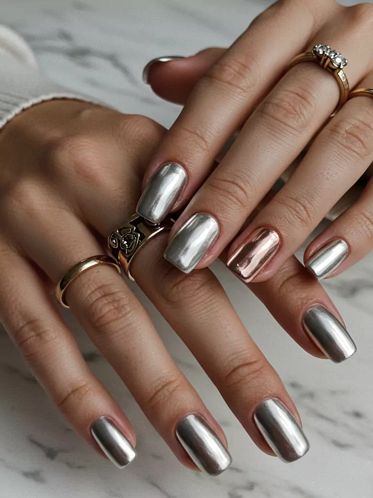 If you want nails that feel a little futuristic and super chic, chrome or metallic finishes are perfect. Silver, rose gold, or pearl chrome catches the light beautifully and makes your nails look sleek and modern.