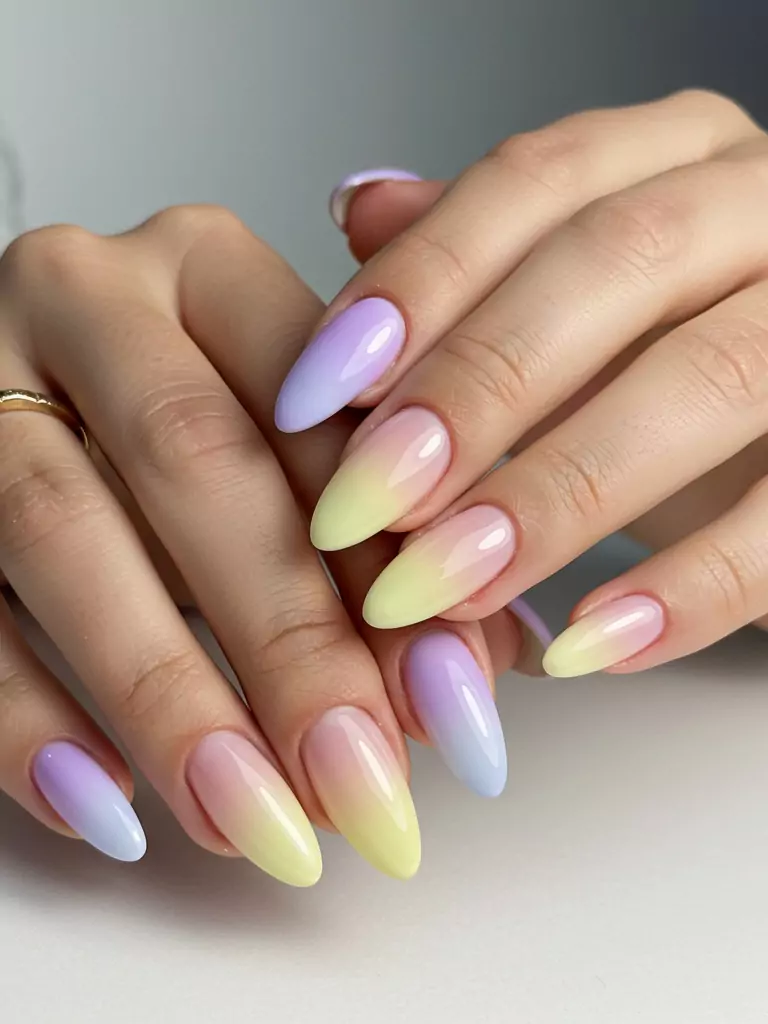 Soft gradients are having a big moment, and pastel ombre looks especially dreamy on almond nails. Blending shades like lavender, pale yellow, and blush pink creates a soft aura effect that feels magical.