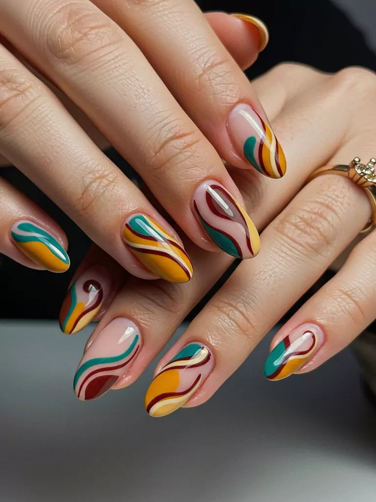 For the artsy souls, retro-inspired abstract nails are a trendy pick. Think wavy lines, swirls, or geometric shapes in earthy tones like mustard, teal, or brown.