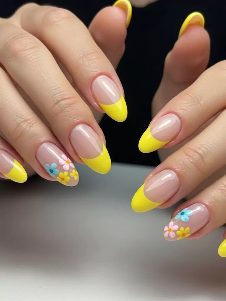 If you love cheerful, sunny nails, this one’s for you. Swap the classic white tip for a bright yellow and add small hand-painted or sticker flowers to one or two nails.